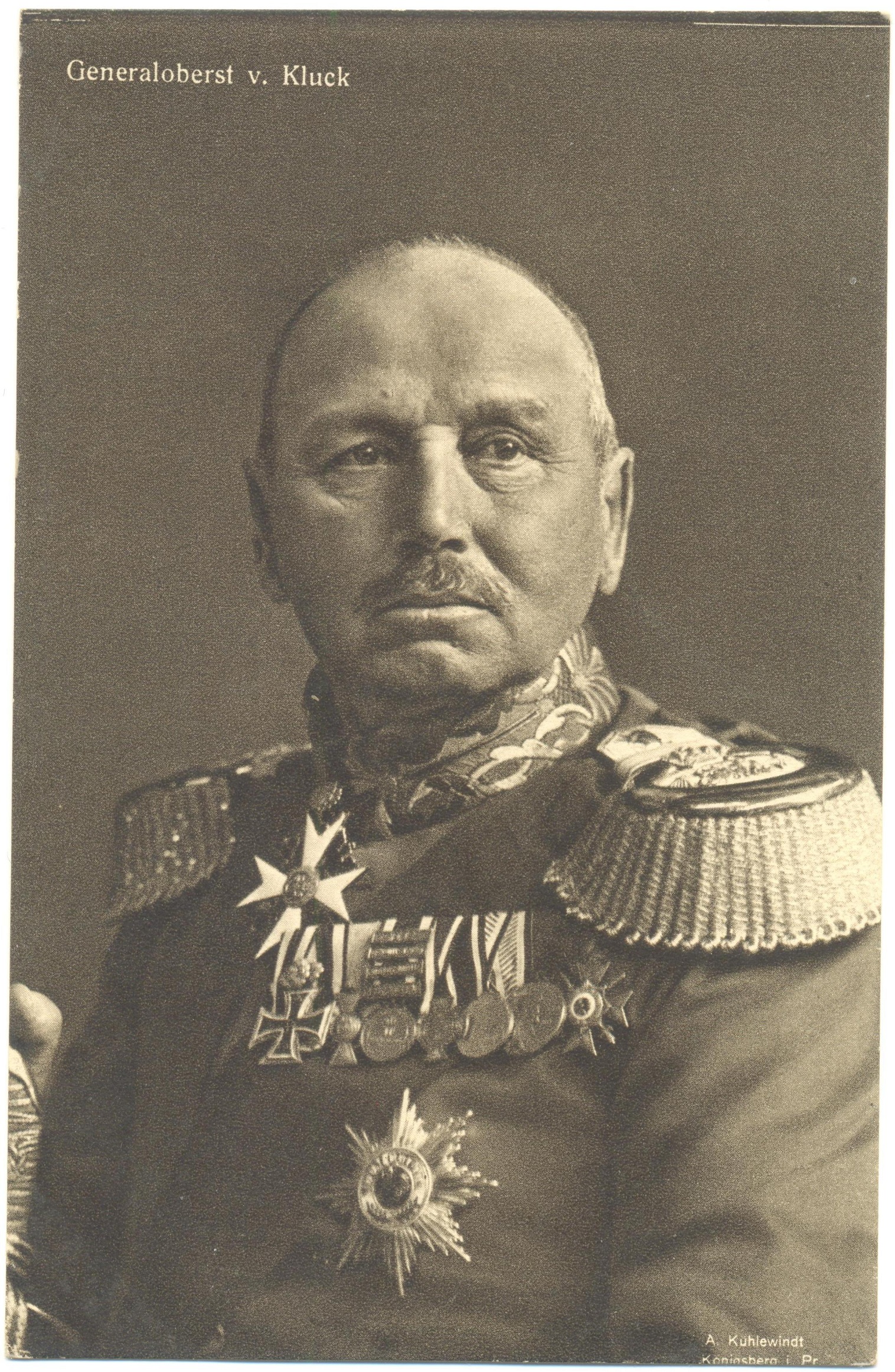 Александр фон Клюк (нем. Alexander Heinrich Rudolph von Kluck), родился 24 июня 1846 г. в Мюнстере, умер 19 октября 1934 г. в Берлине, немецкий военачальник, генерал-оберст (генерал-полковник).