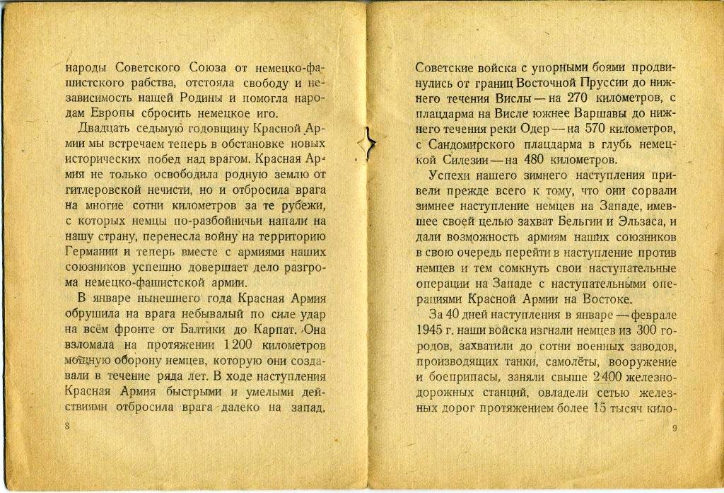 ustas wrote: Всех с наступащим праздником! Как бы и кто бы не относился к нему, тем не менее это Праздник. Любопытно, что ещё на дворе 23 февраля 1945 г. а Сталин говорит о Победе как о свершимшемся факте. Молодец! Да и не только Сталин так думал и говорил в то время. Один из моих родственников ещё в январе писал матери, что мы победили. (Погиб 26.01.1945 г.в Восточной Пруссии). 23 февраля 45г., уже не о Победе думали, а о том, будет ли Советский солдат в Атлантическом океане, сапоги мочить... Военная "машина" и опыт Советских полководцев,-позволяли сделать это, но отсталость в атомной "энергетике", сказало своё слово. С ув. Алекс. |